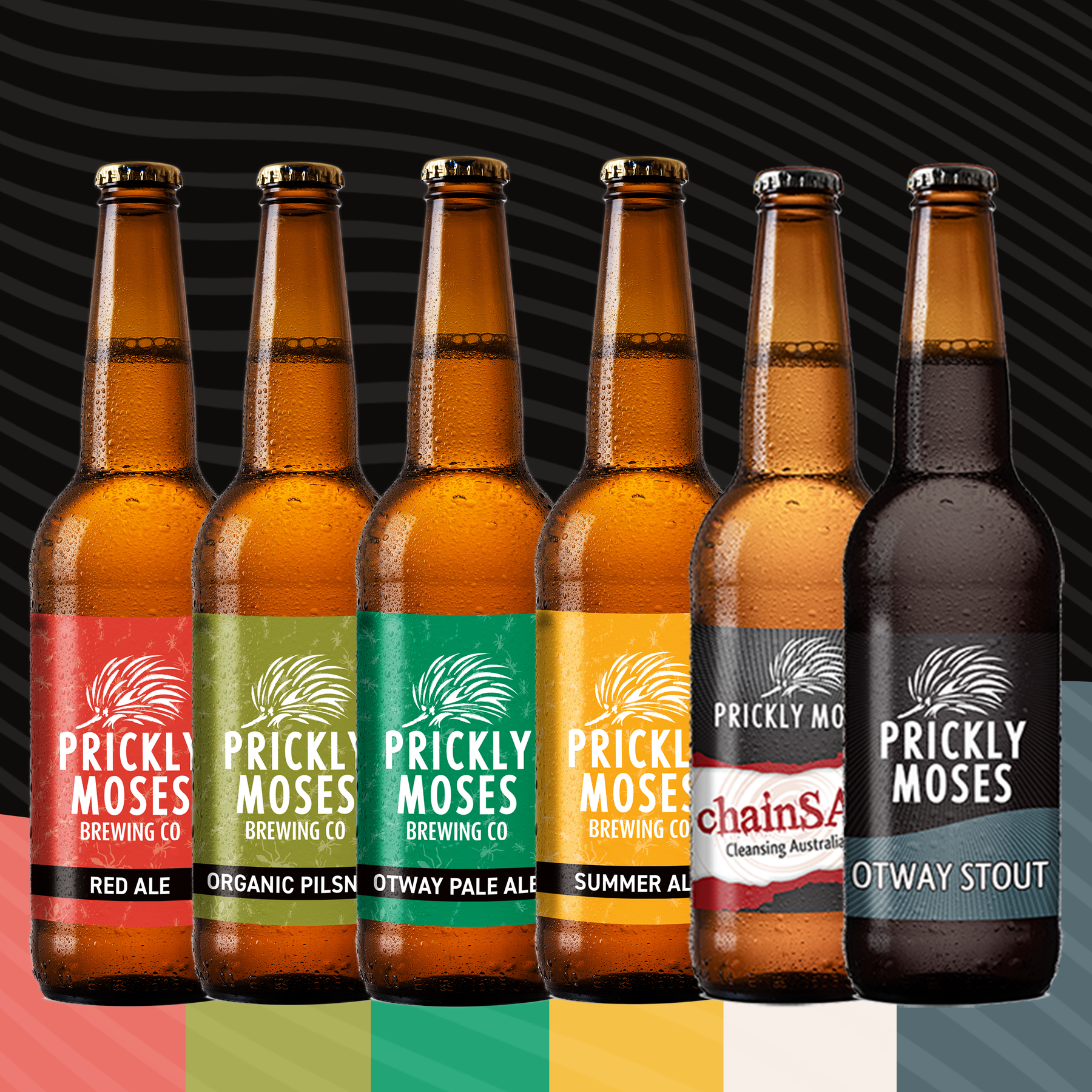 Our Prickly Moses Standard gift pack includes a bottle of Red Ale, Organic Pilsner, Otway Pale Ae, Summer Ale, Chainsaw, and Otway Stout.